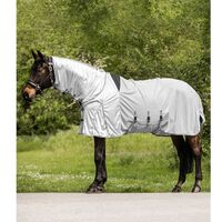 Kombination aus Ekzemer- und Fliegendecke. Halsteil und Schulterbereich aus elastischem, atmungsaktivem Funktions-Faserstoff. Fliegendecke aus feinmaschigem Gewebe mit Bauch- und Schweiflatz zum Schutz vor lästigen Insekten. Doppelter Frontverschluss, extra große Gehfalte, Schweifkordel und Beinschnüre sorgen für einen guten Sitz.